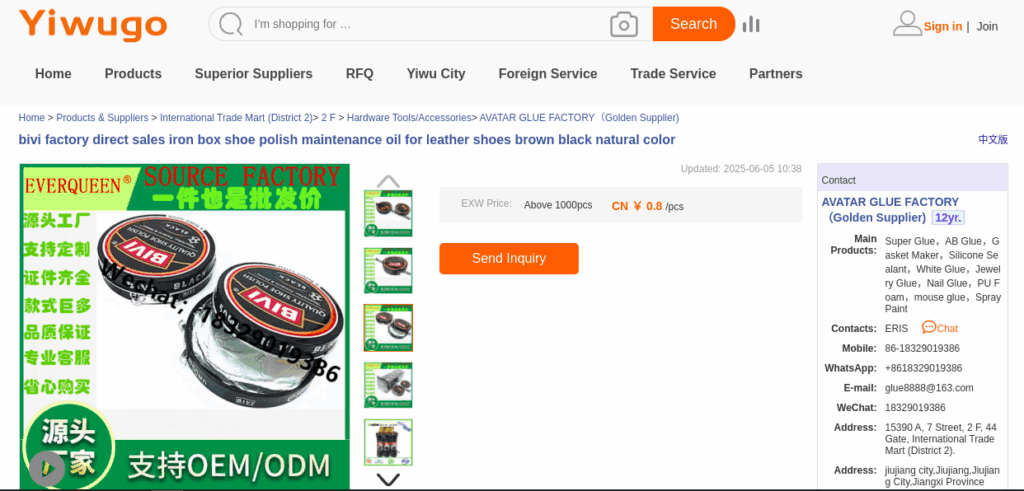 Among their listings is a shoe polish tin that closely resembles the BIVI brand indicating it is available in multiple colours, including options for brown leather. Given the brands and products limited information and export history, it’s likely that BIVI is an OEM white-label item, produced by Avatar Glue Factory (or a similar supplier) to meet the specifications of various importers or distributors. In such arrangements, the manufacturer provides the base product and packaging, while the branding is customised to suit the client’s requirements for an additional price or minimum order quantity (MOQ).